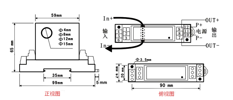电量变送器,单相交流电流0-5A输入,4-20mA输出,24V供电,导轨安装。