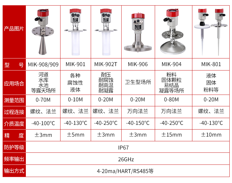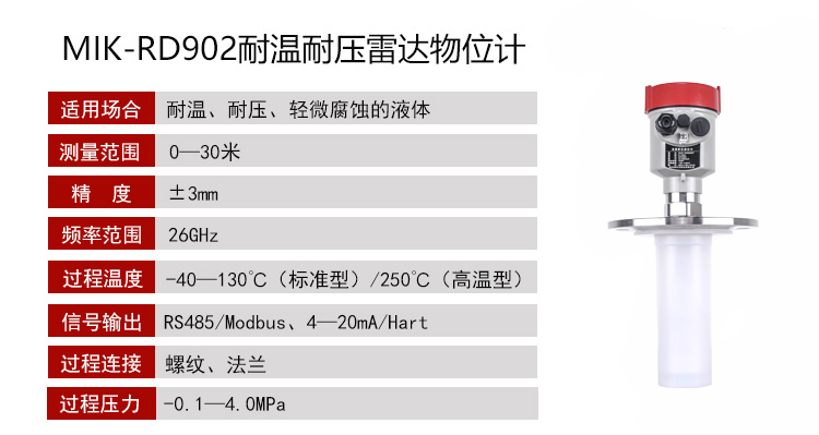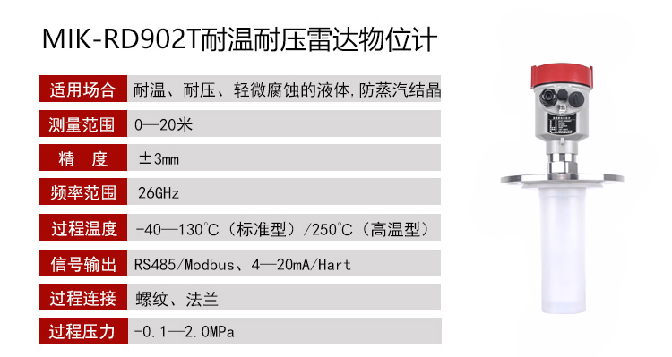 MIK-RD902/902T雷达物位计天线发射极窄的微波脉冲,这个脉冲以光速在空间传播,遇到被测介质表面,其部分能量被反射回来,被同一天线接收。发射脉神与接收脉冲的时间间隔与天线到被测介质表面的距离成正比。由于电磁波的传播速度极高,发射脉神与接收脉神的时间间隔很小(纳秒量级)很难确认,MIK—RD902/902T高频雷达物位计采用种特殊的解调技术,可以准确识别发射脉神与接收脉神的时间间隔,从而进一步计算出天线到被测质表面的距离。