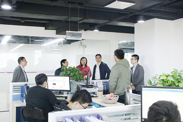 在随后的沟通会中,丁程董事长代表公司对学院领导的莅临指导表示热烈的欢迎,他强调指出,美控与量大专业有较高的契合度,前期也开展了较好的合作与交流,公司现有员工200多人,其中量大的毕业生就有22位,有几位已经是公司的业务骨干、部门负责人,感谢学校为公司发展输送了人才,注入新鲜的血液。随后,他带领学院四位领导走访了公司各个部门,看望慰问了在其中工作的量大校友们。