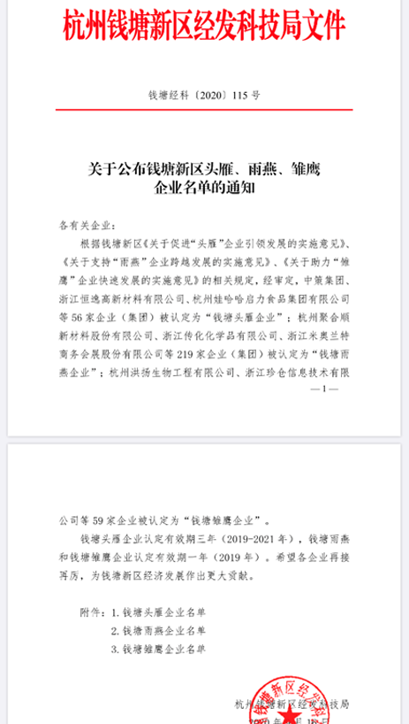 2020年9月16日,杭州钱塘新区经发科技局发布《关于公布钱塘新区头雁、雨燕、雏鹰企业名单的通知》。文件中表明,根据《关于支持“雨燕”企业跨越发展的实施意见》的相关规定,经审定,我司被认定为“钱塘雨燕企业”之一。