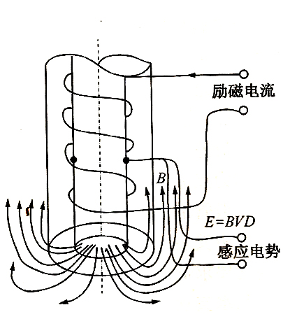 它的工作原理与管道式电磁流量传感器一样也是基于法拉第电磁感应定律。当导电液体以平均流速V且垂直于磁场强度为B磁力线方向通过距离为L的两电极时,在电极间就产生相应的电动势E,法拉第电磁感应定律为: