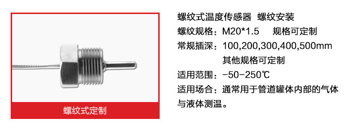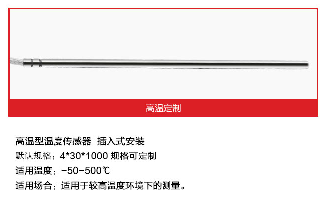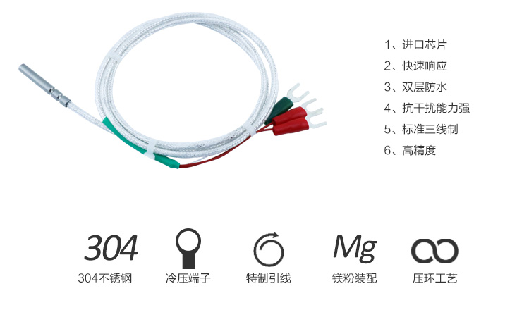 引线式热电阻PT100温度传感器全部采用的进口芯体,采用不锈钢外壳,从而达到稳定性好、精确度高、抗震性能强等特点。引线式热电阻温度传感器可以测量液体、蒸汽和气体介质以及固体表面温度,广泛应用于大棚、仓库、运输车、冷库、实验室、生产车间等环境的温度检测。