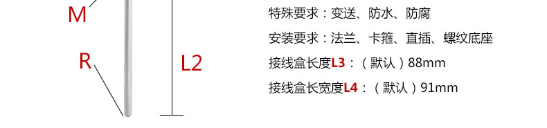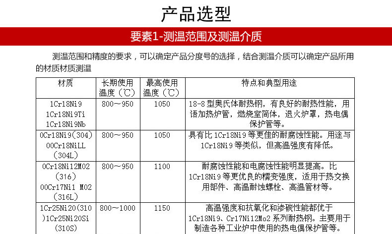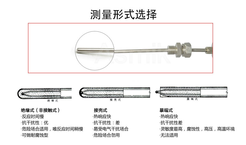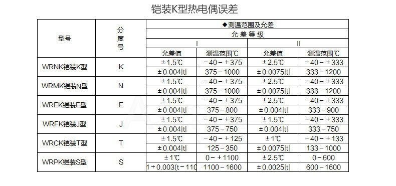 铠装热电阻MIK-WZPK/热电偶MIK-WRNK温度传感器全部采用的进口芯体,采用不锈钢外壳,从而达到稳定性好,精度高,抗震性能强等特点。目前市场上热电阻主要是Pt100,热电偶主要是K型、T型、S型、R型、B型、N型、E型、J型等8种常规型号,具体现场需要热电阻还是热电偶,主要根据现场测温精度与测温范围确定。