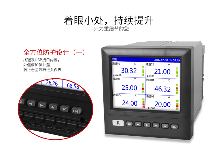 RX6000D系列彩屏无纸记录仪采用高速、高性能32位ARM处理器和5.6英寸LED背光的320*240点阵式液晶显示屏,适用于现场各种压力,温度,流量等信号的检测,控制和记录。