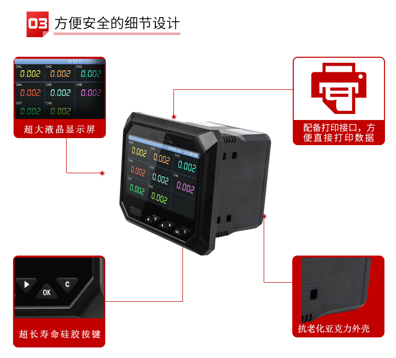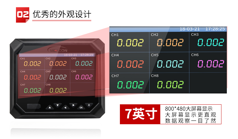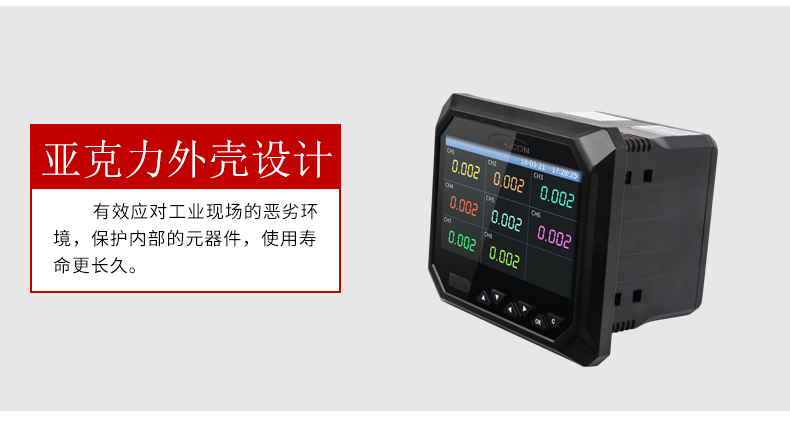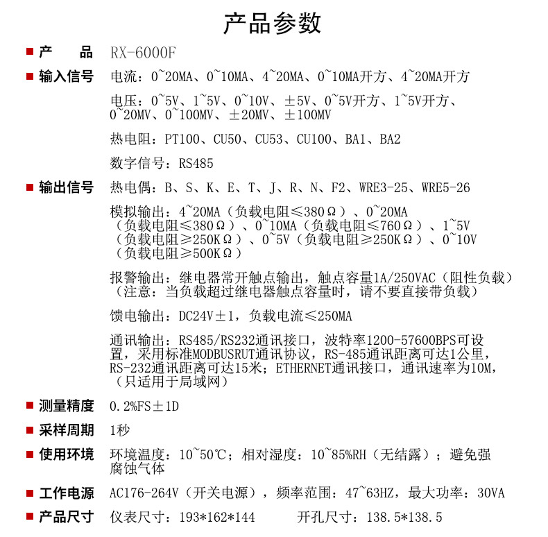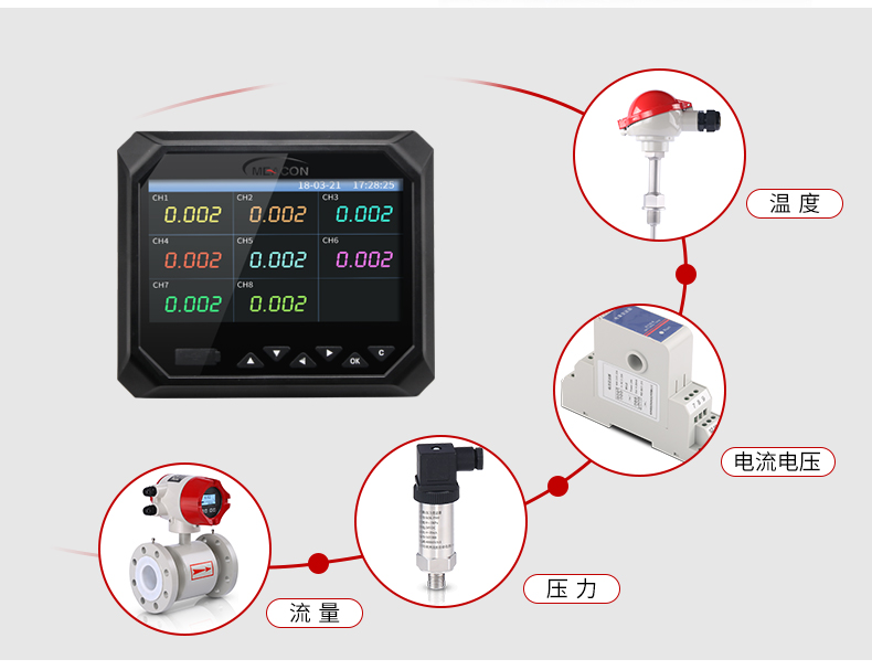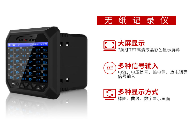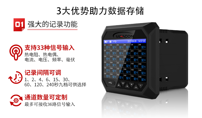 RX-6000F系列无纸记录仪集各种工业场合中数据的测量、显示、处理、运算、报警、记录等多种功能为一体,具有36路模拟量信号输入通道,8路继电器报警输出,150mA配电输出(可接6路两线制变送器,或者2路四线制变器),2路RS-485通讯接口,并拥有1个USB数据转存接口。