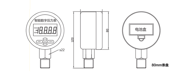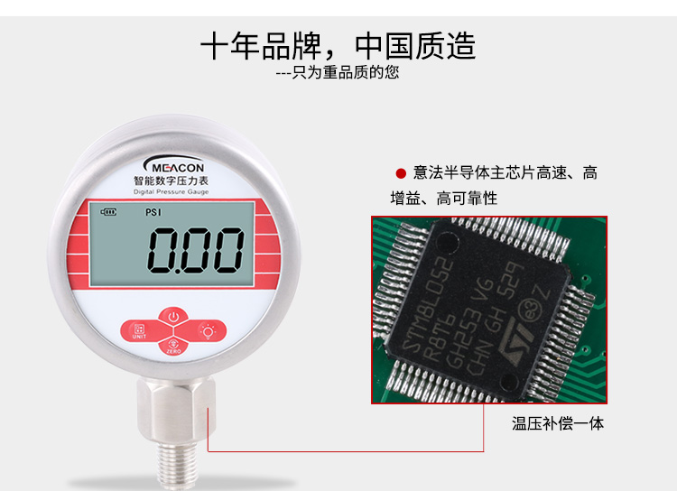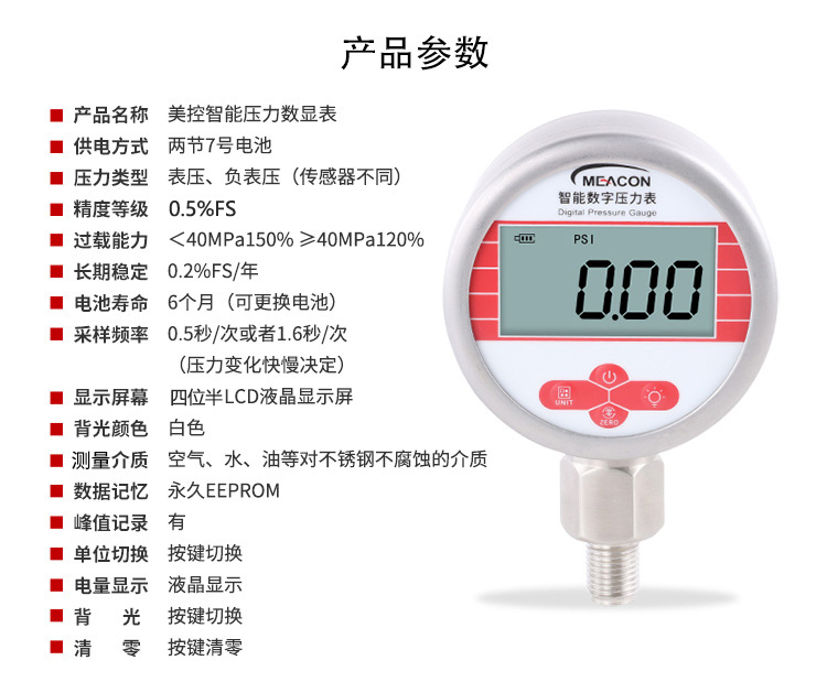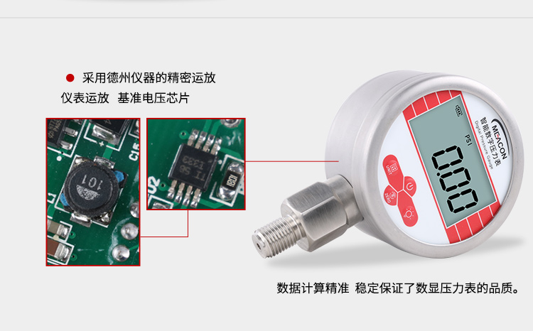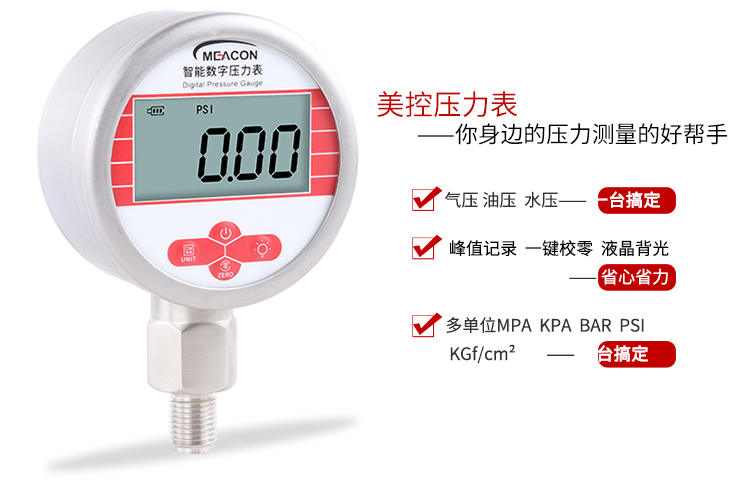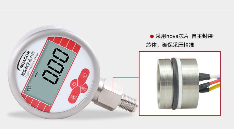 MIK-Y190数显压力表,内置高精度压力传感器,能够准确实时显示压力,并且具有抗震动、显示精度高、稳定性高、可清零等特点。该款智能压力表采用LCD显示屏,具有背光、单位切换等多种功能,操作简单,安装简捷。由于采用低功耗的处理器芯片,续航时间长,具有自动待机与一键清零功能,使用方便。改款智能数显压力表可以测量水、油、空气等对不锈钢无腐蚀的介质,适合压力容器、自动化设备、实验室设备配套的使用。