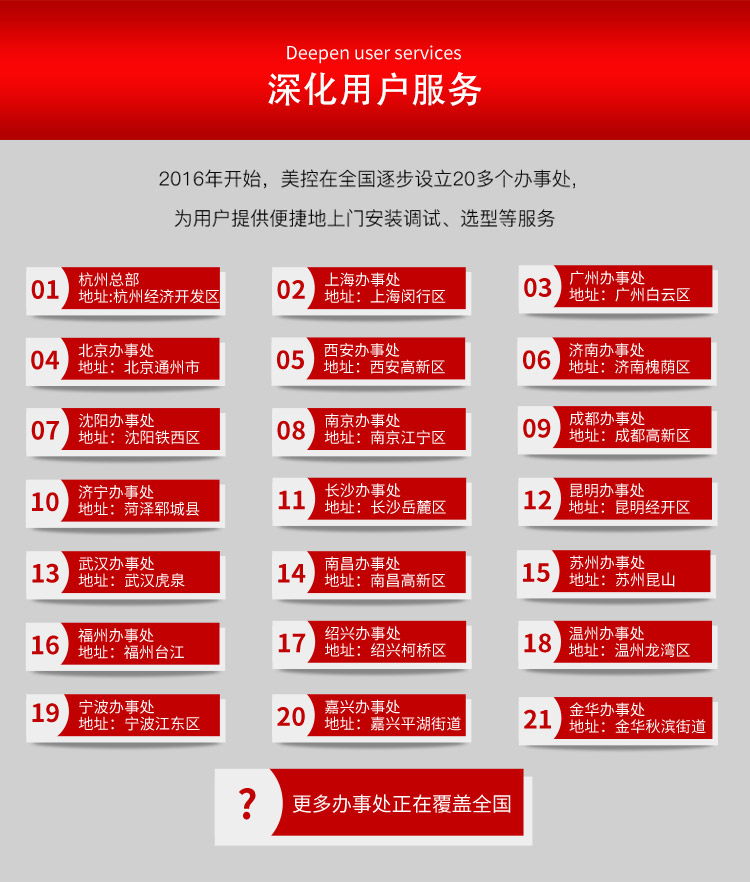 为了服务好每一位新老客户,为了更好的“以客户为中心”,杭州美控已在全国设立了30多处办事处。我们将更好的服务带到您的身边,将中国过程自动化解决方案应用到每一位需要我们的用户家中。