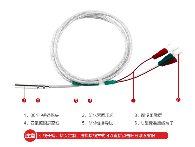 引线式热电阻温度传感器全部采用的进口芯体,采用不锈钢外壳,从而达到稳定性好、度高、抗震性能强等特点。引线式热电阻温度传感器可以测量液体、蒸汽和气体介质以及固体表面温度,广泛应用于大棚、仓库、运输车、冷库、实验室、生产车间等环境的温度检测。