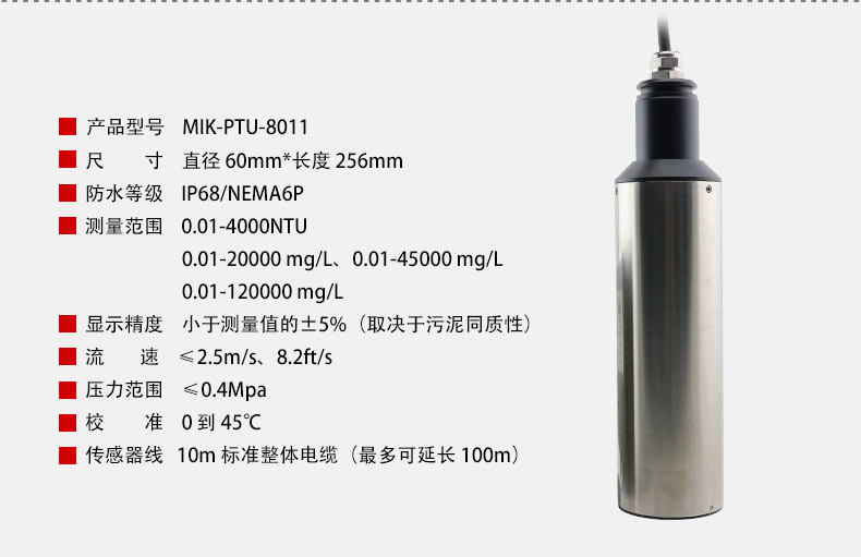 MIK-PTU100浊度/污泥浓度传感器的原理基于组合红外吸收散射光线法,应用国际浊度测定标准ISO7027方法可以连续并精确地测定浊度或污泥浓度。