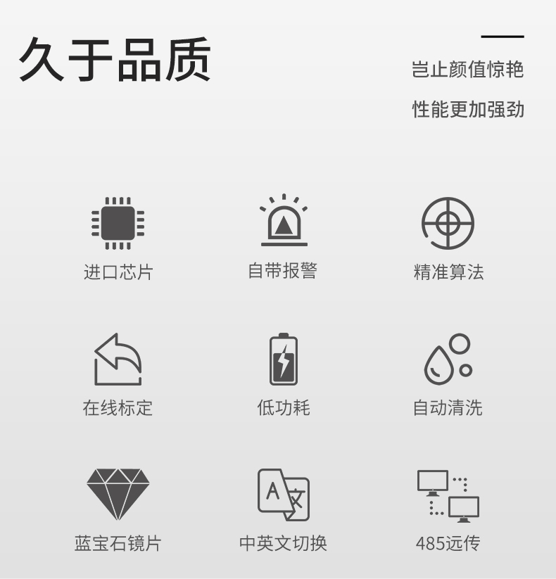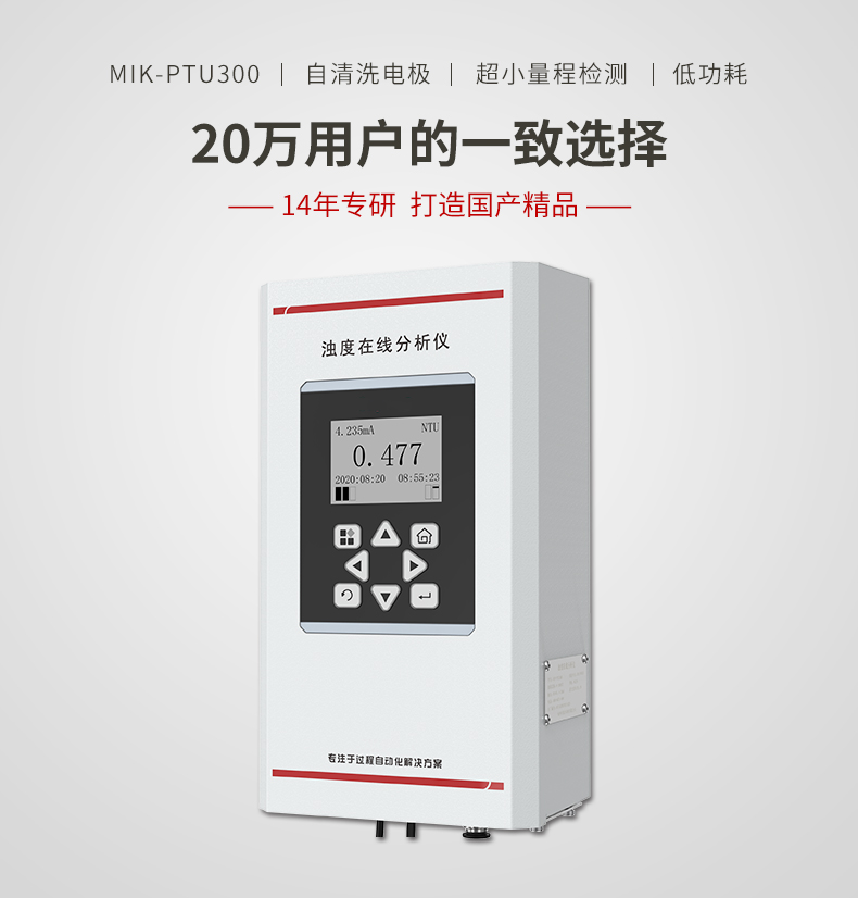 MIK-PTU300浊度在线分析仪是针对饮用水水质在线监测,量身研发的具有自主 知识产权的专利产品,具有超低浊度检出限、高精度测量、设备长时间 免维护、省水工作和数字化输出的特点,支持云平台和手机移动端数据 远程监控,以及 RS485-modbus 通讯,可广泛应用于自来水出厂水、二次 供水、管网末梢水、直饮水、膜过滤水、游泳池、地表水等浊度在线监测。
